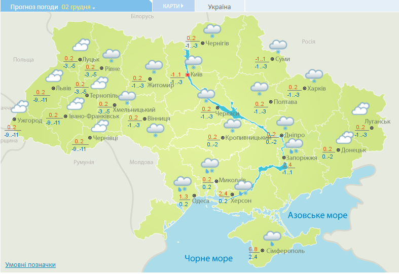 В среду, 2 декабря, осадки ожидаются в тех же регионах и распространятся на Винницкую, Хмельницкую, Житомирскую, Харьковскую и Запорожскую, при этом морозы будут еще сильнее. Днем ожидается от 0 до +4 градусов, ночью ударят морозы до -11 градусов на западе, -1 -3 - на остальной территории.