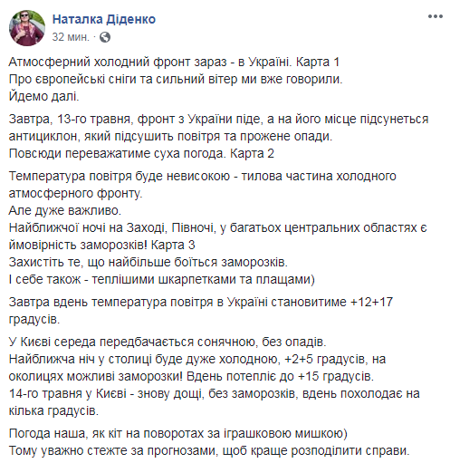 Об этом сообщает синоптик Наталья Диденко на своей Facebook-странице.