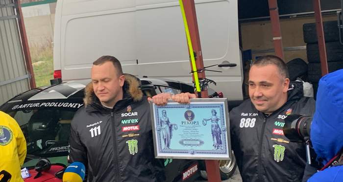 Юрий Рак и Артур Подлужный проехали в парном заносе на скорости 212 км в час. Они были за рулем авто Nissan Z350 и Toyota BRZ. На них они провели 3 сета по 3 заезда в каждом. Отмечают, что в машинах установлены GPS-трекеры, которые измеряли точную скорость движения.