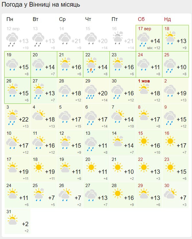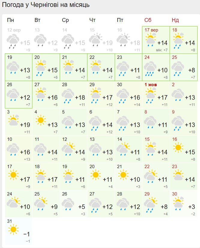 В Чернигове ливни также закончатся ближе к 15 октябрю. Далее будет солнечная и сухая неделя, вплоть до 24 числа. 31 октября, на Хеллоуин, будет -1 градус мороза, а самым теплым днем будет 3 октября до +19 градусов.