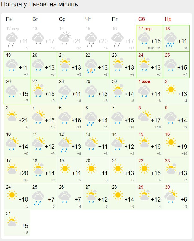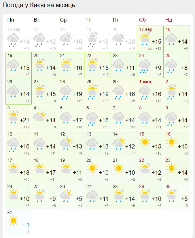В Киеве дожди закончатся только 15 октября. Перерыв в осадках пройдет до 24 октября, а далее погода будет становиться все холоднее и 31 числа будет -1. Максимально тепло будет 3 октября до +21 градус.