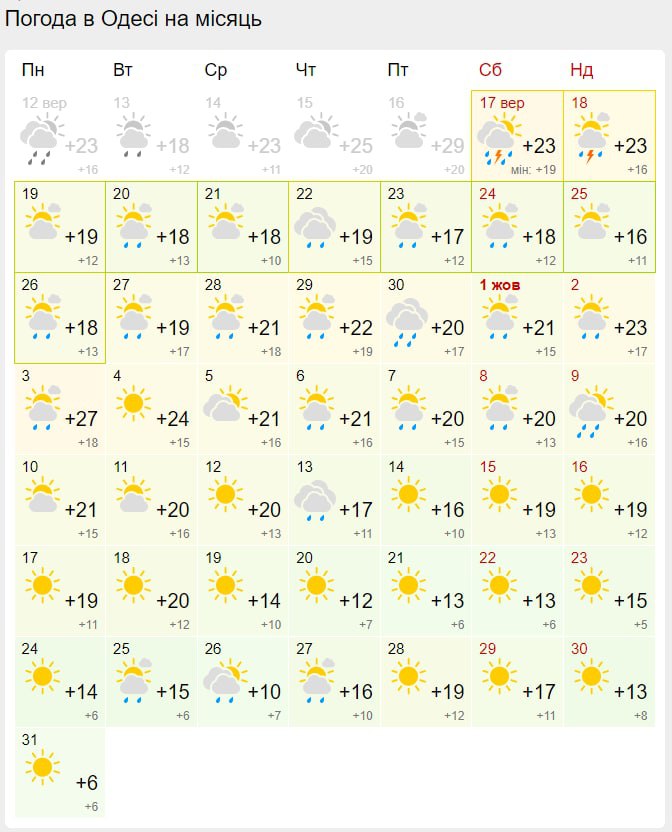 В Одессе ожидаются дожди все ближайшие дни, до 10 октября, при этом рекордно высокая температура за месяц будет +27 градусов 3 числа. С 14 октября и до конца месяца практически не будет дождей.