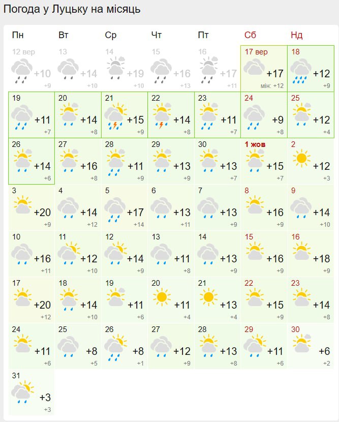 В Луцке самый теплый день ожидается 3 октября до +20 градусов тепла. До 1 октября будут обильно идти дожди, которые продолжатся уже 4 числа и продлятся до 15 октября. Далее прогнозируют теплую и сухую погоду до 25 числа.