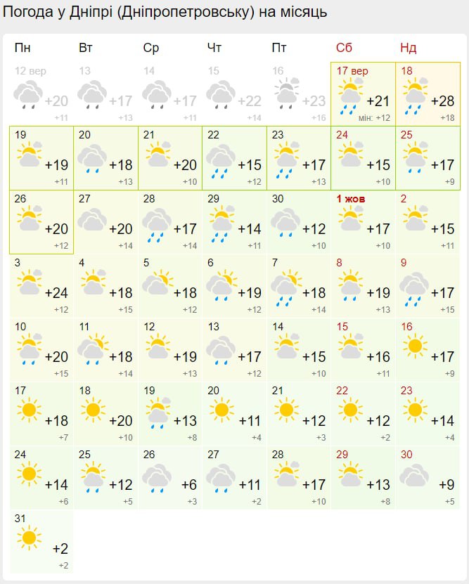 В Днепре дождей будет не так много, как в других городах Украины. 3 октября будет тепло до +24 градусов - это максимальная температура за месяц. Холода наступят с конца октября.
