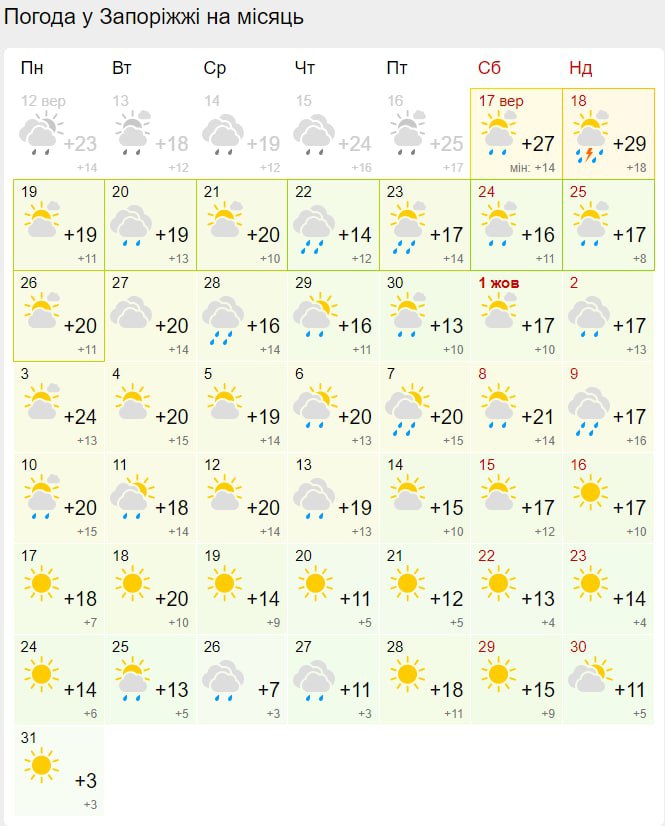 В Запорожье дожди закончатся только 15 октября. Поэтом стоит подготовить зонты. 3 октября будет +24 градуса тепла, а с 15 по 24 число ожидается сухая и теплая погода.