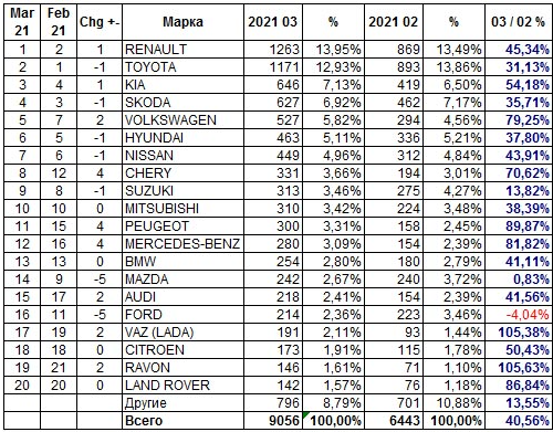 Практически все операторы автомобильного рынка фиксировали в марте значительный рост продаж, некоторым даже удалось увеличить продажи вдвое.