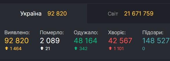 В Украине за минувшие сутки зафиксировали 1 464 новых случая заболевания коронавирусной инфекцией. Всего по состоянию на утро понедельника, 17 августа, в стране подтверждено 92 820 случаев COVID-19.