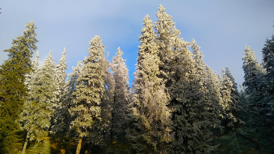 Снимки были сделаны во время подъема на гору Высокая, расположенную на высоте 1803 метра над уровнем моря. Как видно на снятых кадрах, горы еще не покрыты снегом, но колючки инея, который образовался на кустарниках и деревьях создают картину сказочного зимнего царства.