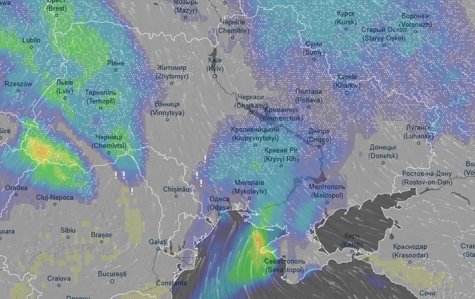 Об этом свидетельствуют данные радара погоды Ventusky.