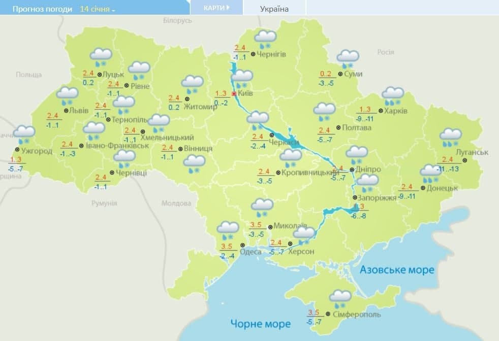 Днем температура воздуха будет колебаться от -1 до +1°С, ночью -2-4°С. На Закарпатье ночью ожидается сильный мороз -6-8°С.