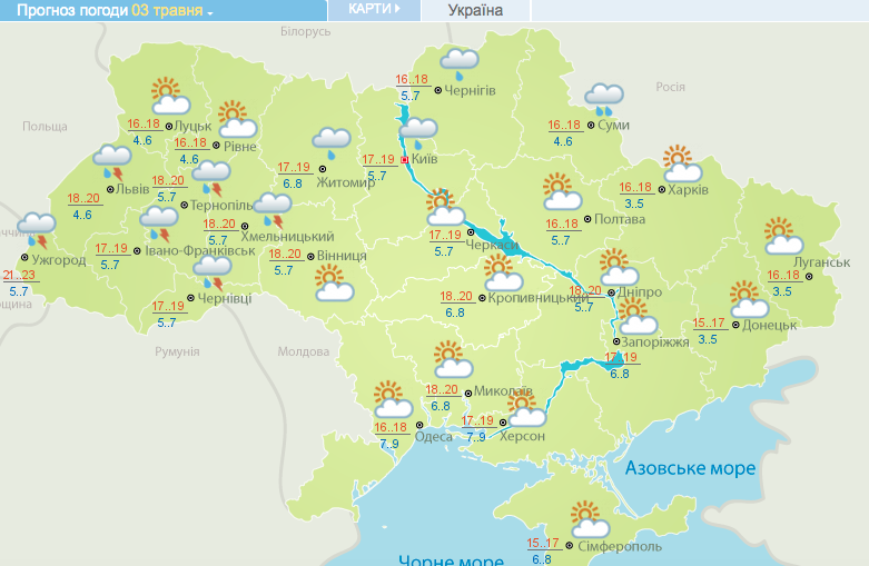 Во вторник, 3 мая, грозы накроют все западные области Украины, сухо будет только на Волыни. Небольшое осадки пройдут на севере страны, а на северо-востоке возможны ливни. В остальных регионах в этот день будет сухо. В ночное время температура воздуха будет колебаться от +4 до +9 градусов, днем на юге прогреется до 21 со знаком "плюс". В столице во вторник пройдет дождь (ночью без осадков) и ожидается усиление ветра. Ночью в Киеве +5 +7 градусов, днем температура прогреется до +19 градусов.