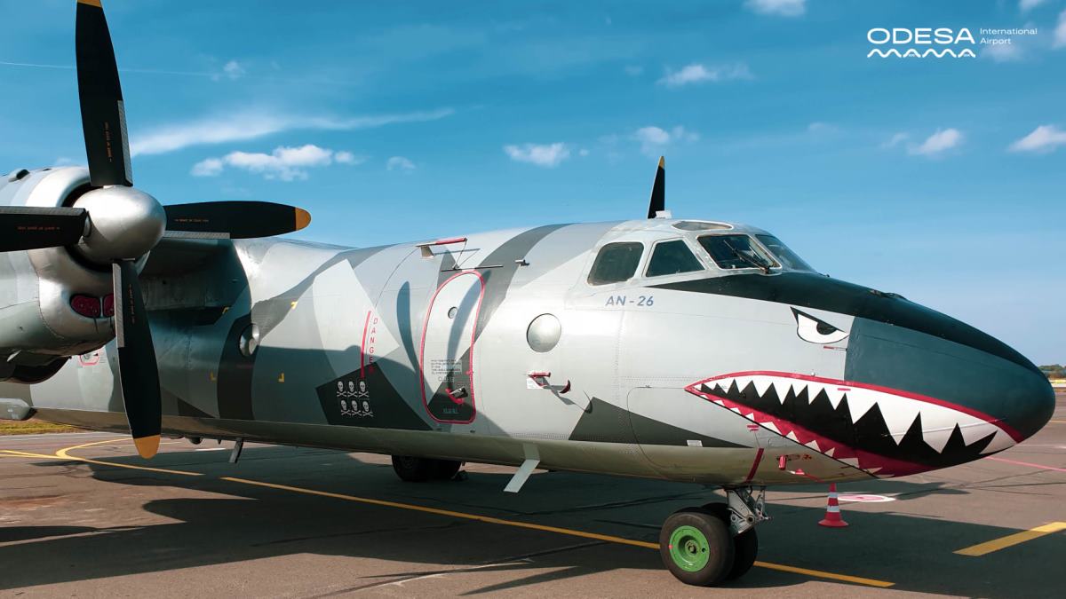 Летательный аппарат АН-26 разрисован в виде акулы.
