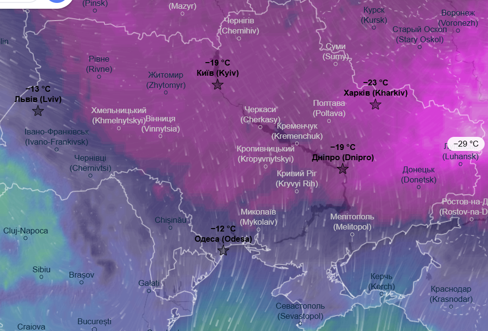 3 февраля эпицентр сильных морозов переместится на крайний восток - в Луганской области синоптики прогнозируют морозы вплоть до -29 градусов. На остальной территории страны ночью ожидается от -13 до -26 градусов.
