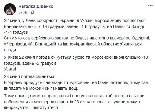 Как сообщал "Апостроф", ранее Диденко сообщила о возвращении морозов на День Соборности, во вторник, 22 января.