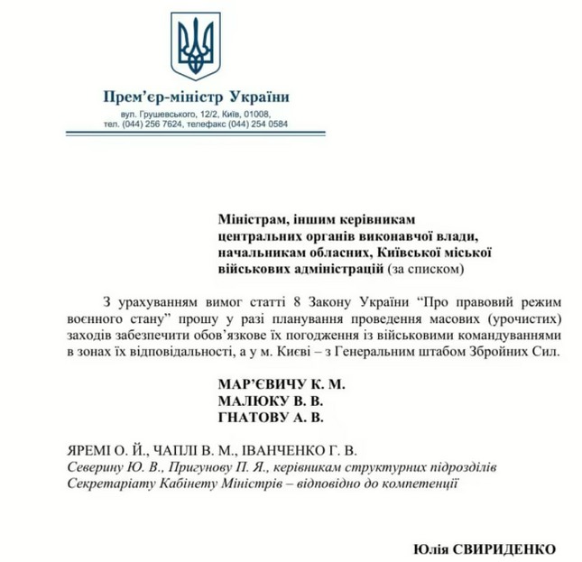 "С учетом требований статьи закона Украины "О правовом режиме военного положения" прошу в случае планирования проведения массовых (торжественных) мероприятий обеспечить обязательное их согласование с военными командованиями в зоне их ответственности, а в Киеве – с Генеральным штабом Вооруженных сил", – говорится в документе, опубликованном УП.