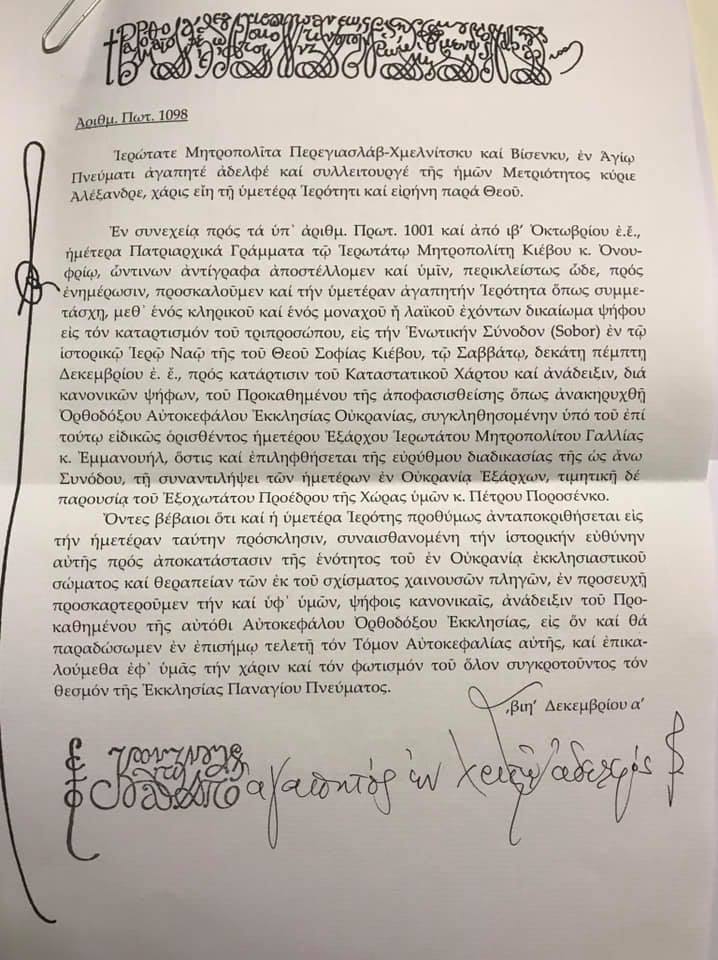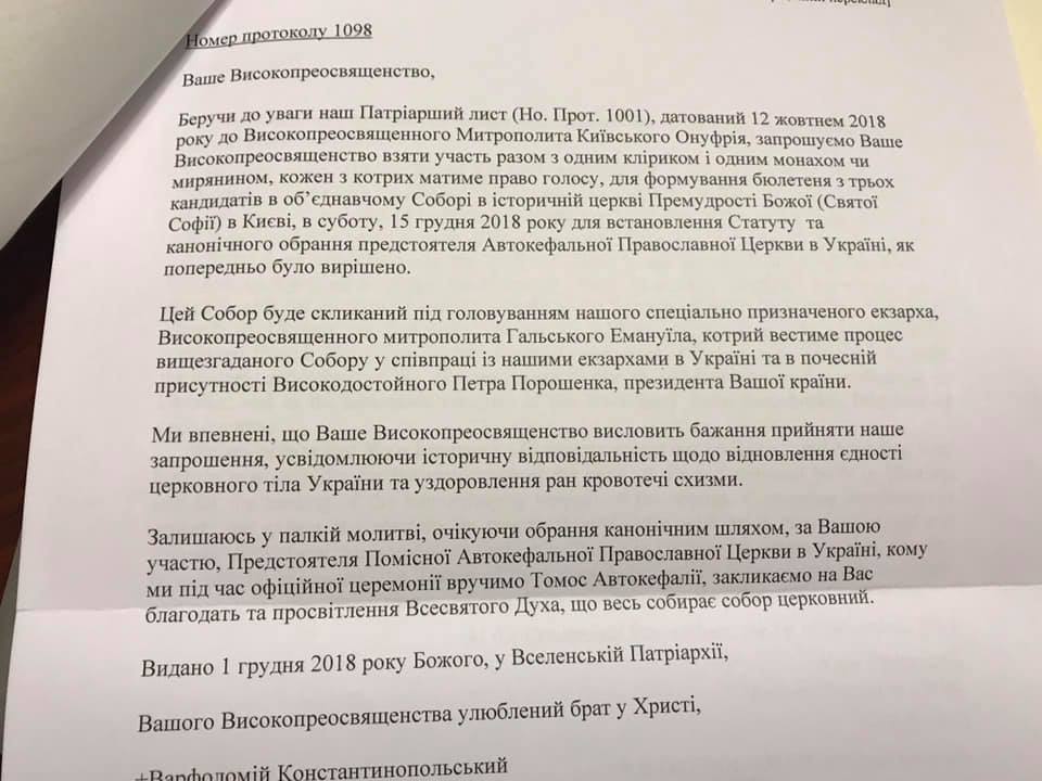 "Приглашаем Ваше Высокопреосвященство принять участие вместе с одним клириком и одним монахом или мирянином, каждый из которых будет иметь право голоса, для формирования бюллетеня из трех кандидатов в объединительном Соборе в исторической церкви Премудрости Божией (Святой Софии) в Киеве, в субботу, 15 Декабря 2018 для установки Устава и канонического избрания предстоятеля Автокефальной Православной Церкви в Украине, как предварительно было решено", - говорится в письме Вселенской Патриархии.