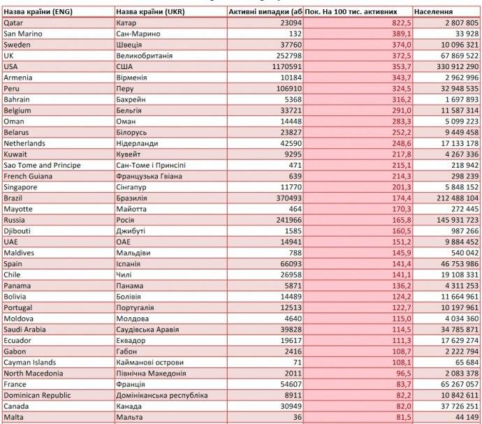 Министерство здравоохранения Украины обнародовало список стран, которые по показателям заболеваемости COVID-19 относятся к "красной" и "зеленой" зонам. Государствами с широким распространением COVID-19 считаются те страны, в которых количество активных случаев заболевания COVID-19 составляет более 40 человек на 100 тысяч населения.