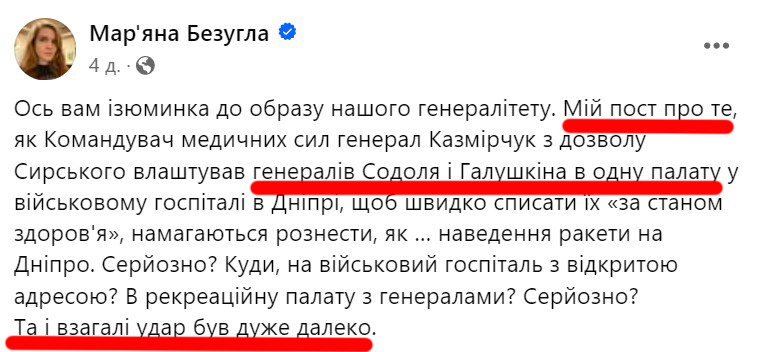 Народный депутат, заместительница председателя комитета по вопросам национальной безопасности, обороны и разведки Марьяна Безуглая слила данные о пребывании в больнице в Днепре экс-командующего Объединенными силами ВСУ Юрия Содоля и экс-командующего оперативно-тактической группировкой "Харьков" Юрия Галушкина.