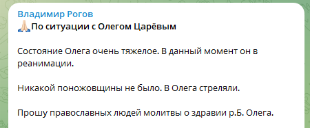 В то же время нападение на Царева подтвердили так называемые "власти" Запорожской области. По словам Владимира Рогова, состояние Царева "очень тяжелое", он находится в реанимации.