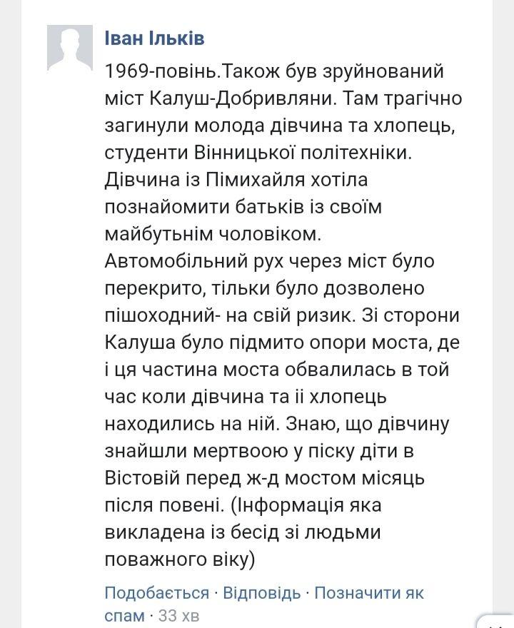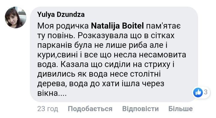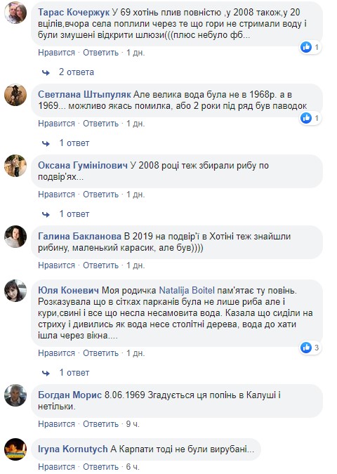 "В 69 хотинь плыл полностью, в 2008 также в 20 уцелел, вчера села поплыли потому что горы не сдержали воду и были вынуждены открыть шлюзы", "В 2008 году тоже собирали рыбу по дворам", "А Карпаты тогда не были вырублены ...", "Моя родственница помнит то наводнение. Рассказывала что в сетях заборов была не только рыба но и куры, свиньи и все несла неистовая вода. Говорила что сидели на чердаке и смотрели как вода несет столетние деревья, вода в дом шла через окна ....", - пишут они.