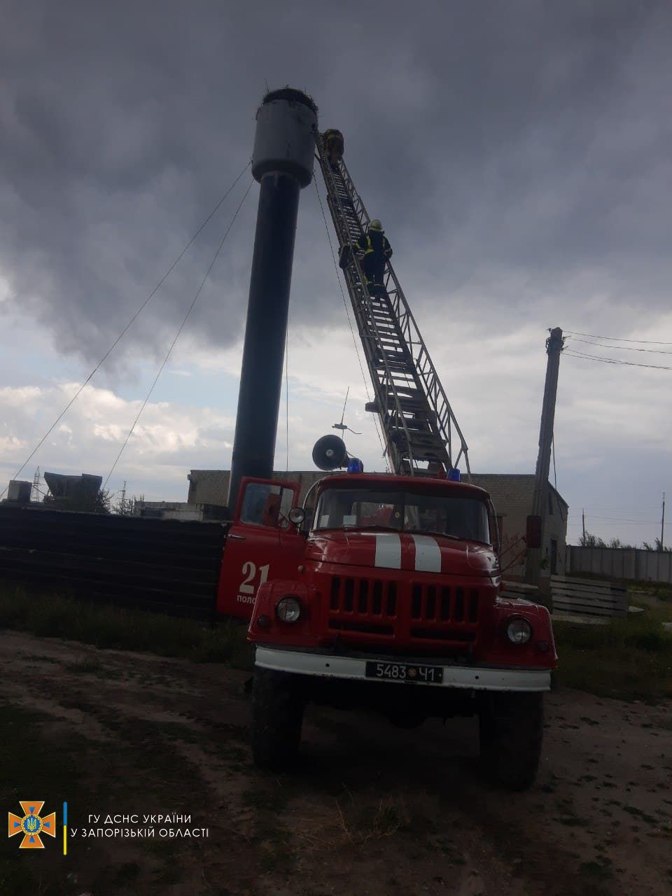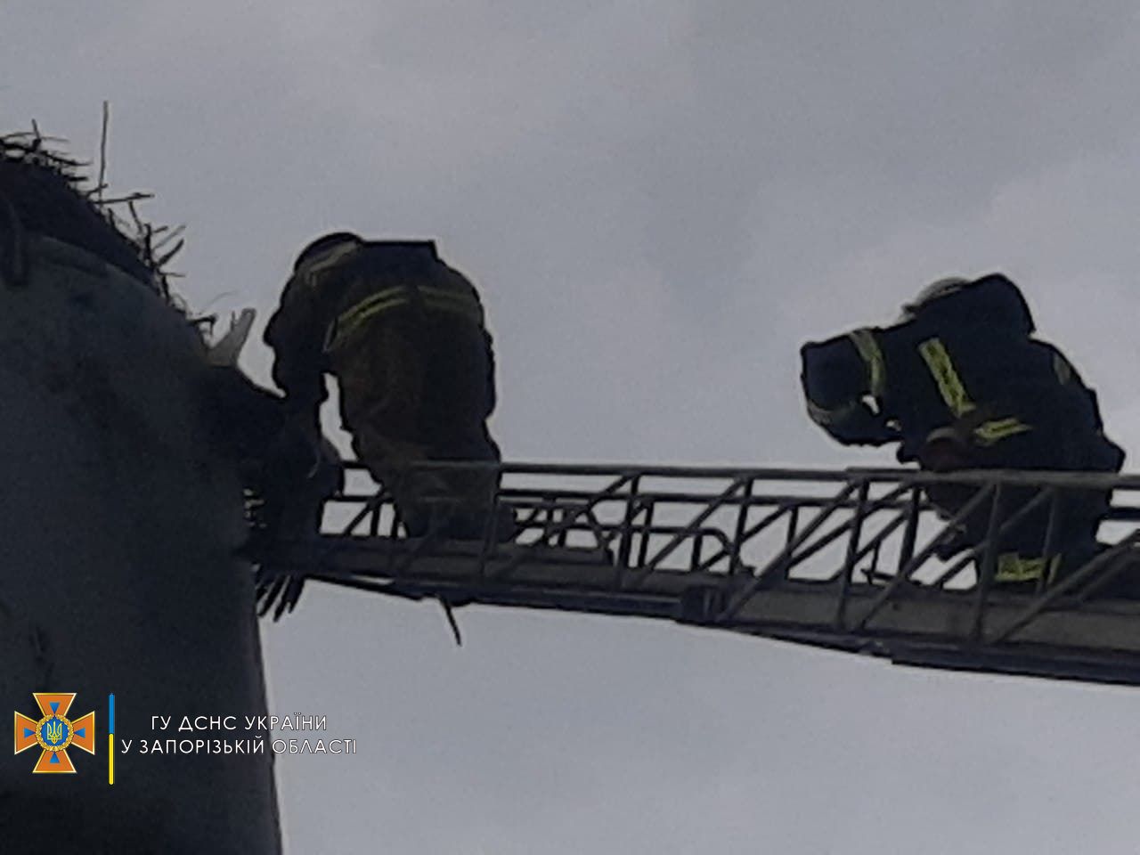 В пятницу, 20 августа, в городе Пологи Запорожской области, на водонапорной башне, возле своего гнезда застрял птенец аиста. Для его спасения вызвали сотрудников ГСЧС.