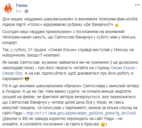 "Так, в субботу, 21 декабря, "Океан Эльзы" действительно выступал в Минске на новогоднем мероприятии ИТ-компании. Как говорил Святослав, музыкой заниматься он не прекращает (и это разрешено законодательством)", - указано в сообщении пресс-службы "Голоса".