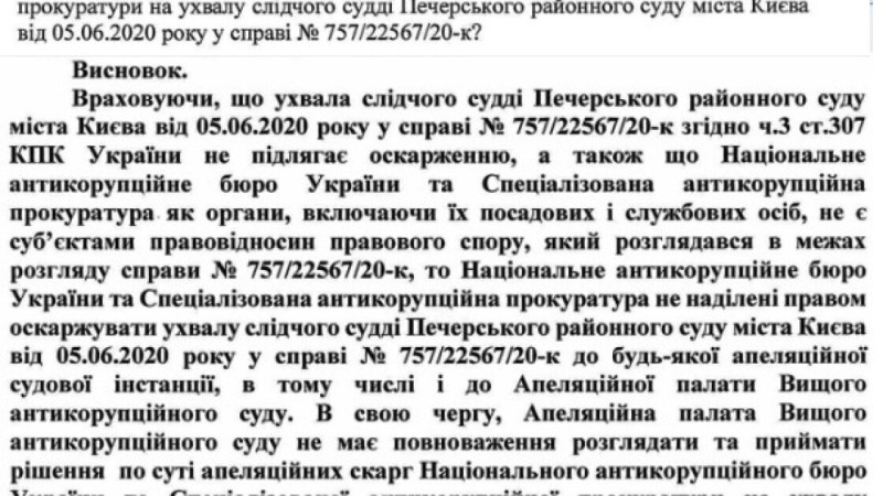 "Учитывая, что постановление следственного судьи Печерского райсуда Киева от 05.06.2020 года по делу № 757/22567/20-к согласно ч.3 ст.307 УПК обжалованию не подлежит, а также что НАБУ и САП как органы, включая их должностных и служебных лиц, не являются субъектами правоотношений спора, который рассматривался в рамках рассмотрения дела, то НАБУ и САП не наделены правом обжаловать определение судьи в любую апелляционную инстанцию, в том числе и в Апелляционную палату ВАКС".