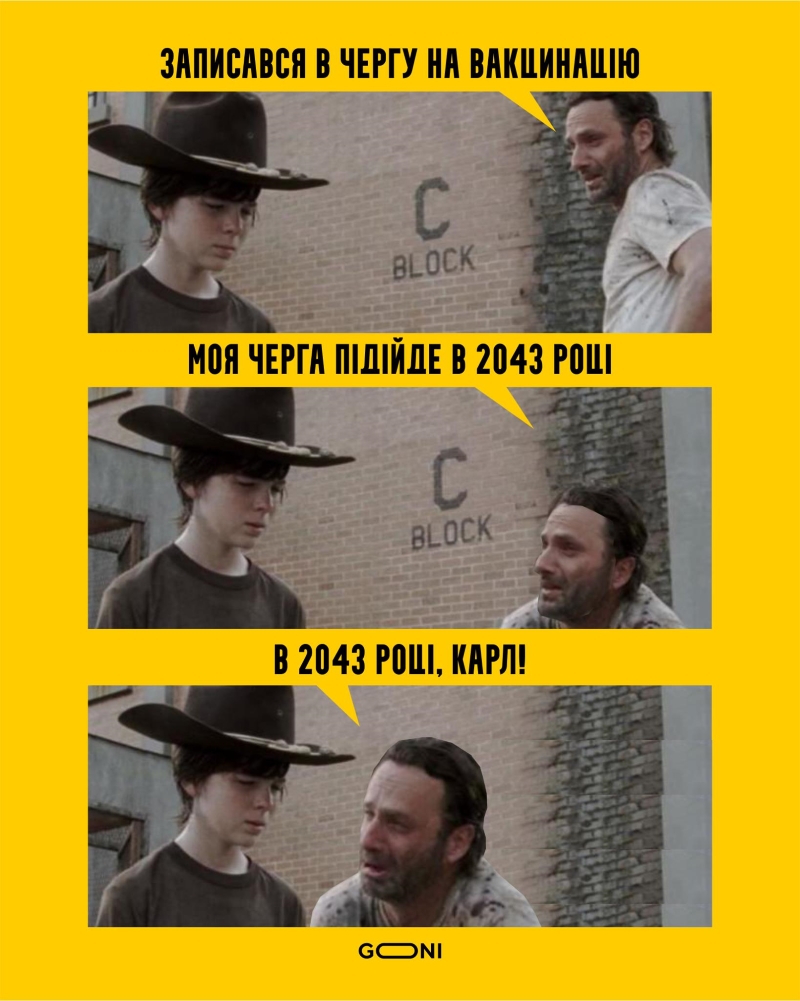 На ней обыгран известный мем, на котором герой говорит: "Записался в очередь на вакцинацию. Моя очередь подойдет в 2043 году. В 2043 году, Карл!".