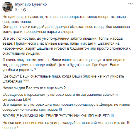 "Практически счастливые мамы, папы и их дети шатаются на набережной, жарят шашлыки, играют в бадминтон или просто слоняются с счастливыми лицами. Я очень хочу посмотреть на Ваши счастливые лица, спустя две недели, когда эпидемия в городе войдет (а это будет) в пик. Где будут Ваши улыбки и радость? Где будут Ваши счастливые лица, когда Ваши близкие начнут умирать штабелями?" – написал Лысенко.