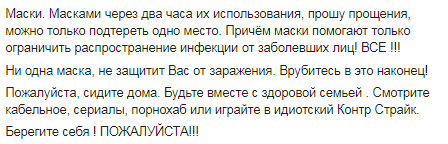 "Маски. Масками через два часа их использования, прошу прощения, можно только подтереть одно место. Причем маски помогают только заболевшим лицам. Ни одна маска, не защитит Вас от заражения. Врубитесь в это наконец! Пожалуйста, сидите дома. Будьте вместе с здоровой семьей. Смотрите кабельное, PornHub или играйте в идиотский Counter Strike. Берегите себя! Пожалуйста!" - обратился к украинцам заместитель мэра.