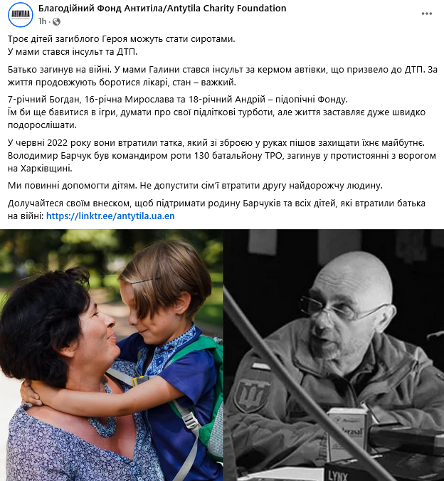 "Присоединяйтесь своим вкладом, чтобы поддержать семью Барчуков и всех детей, потерявших отца на войне", - добавили в БФ "Антитела".