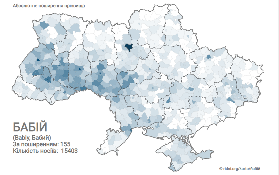 Скажем, фамилия Бабий насчитывает 15 403 носителей и по распространению занимает 155 место.
