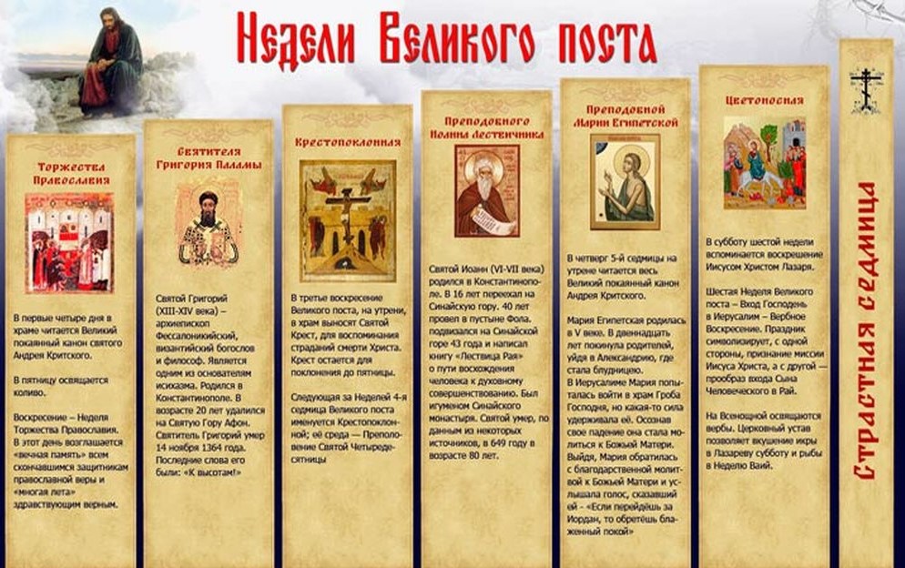 7 неделя – Страстная седмица. В эту неделю вспоминают последние дни жизни на земле, страдания, смерть и как был погребен Иисус Христос.