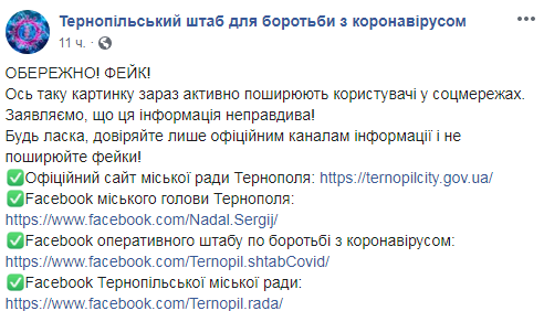 Ложность этого сообщения подтвердили в Facebook Тернопольского штаба по борьбе с коронавирусом.