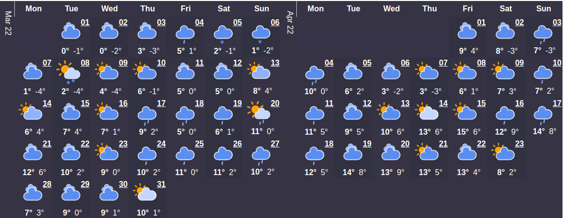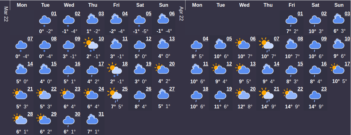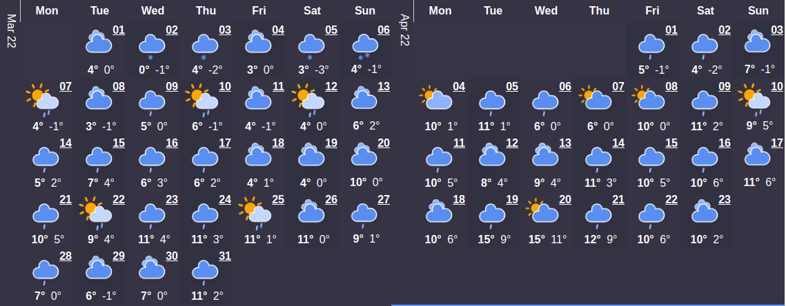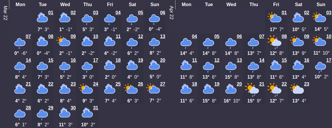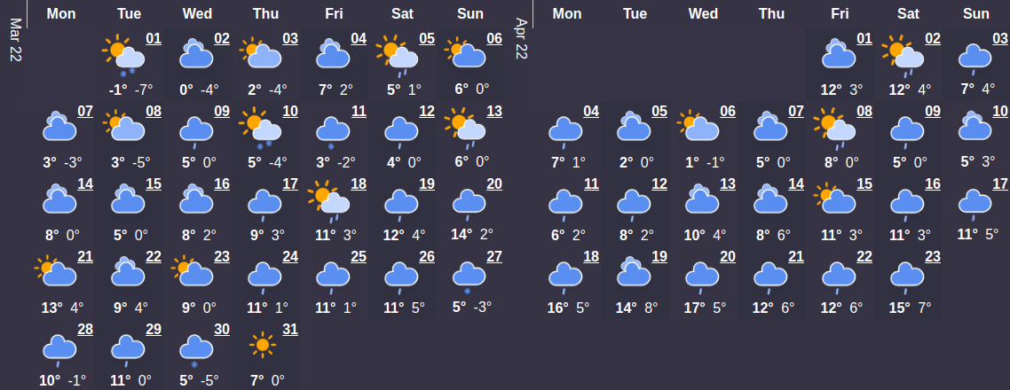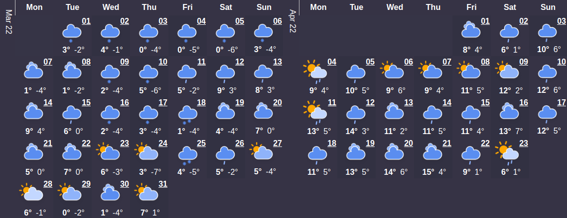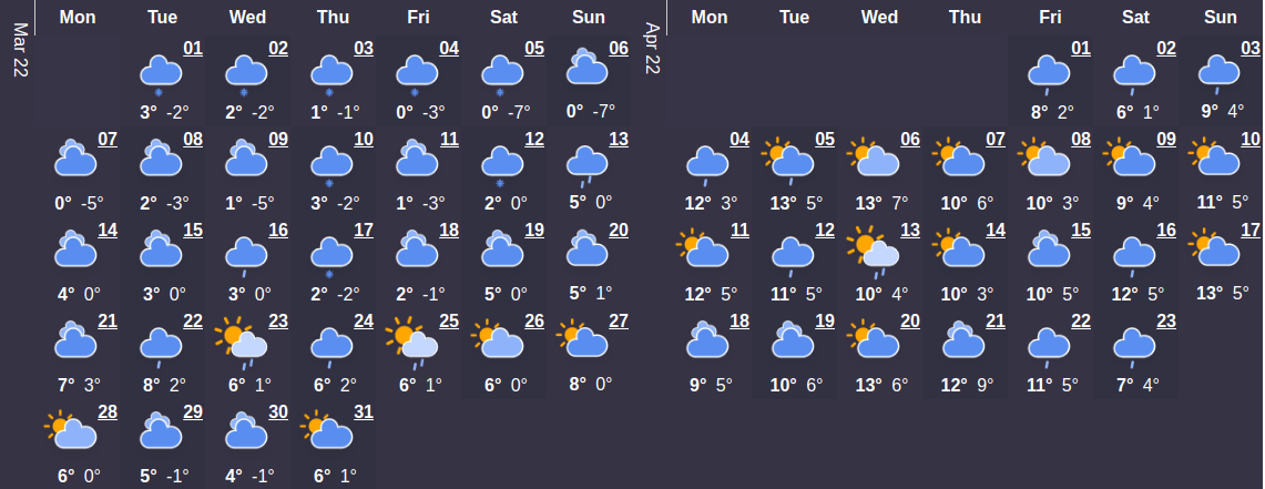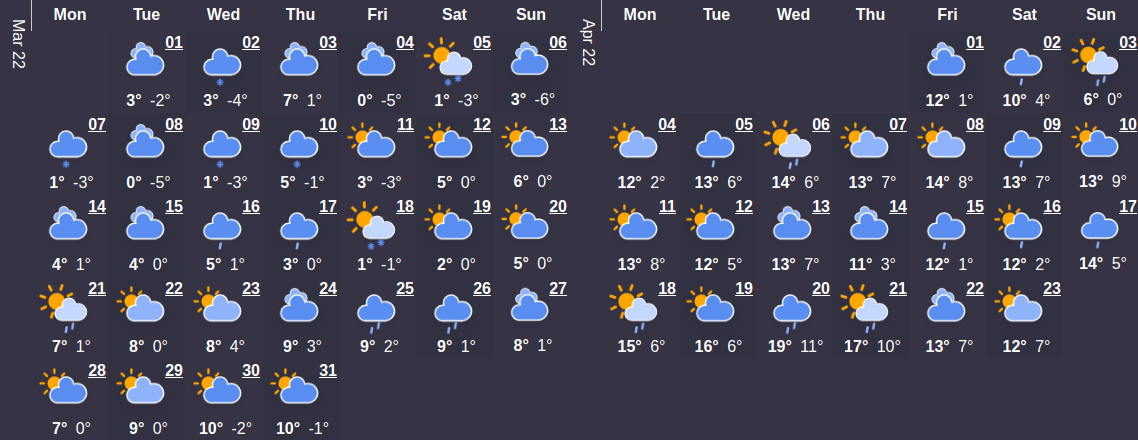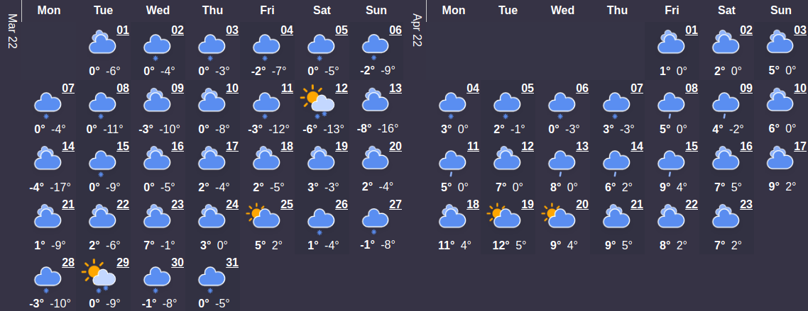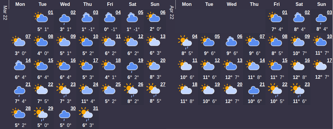 Первый месяц весны будет холоднее, чем в марте сезона прошлого года. Средний температурный показатель составляет 4°C. В начале месяца температура будет колебаться на уровне 1°C. Максимальная температурная отметка наступит 23 марта и будет составлять 11 ° C - самое время сменить гардероб по сезону. Относительно большого количества осадков в этом месяце можно не беспокоиться – их ожидается в среднем не больше 1 дней.