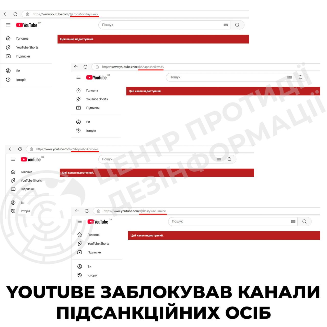 В Центре противодействия дезинформации при Совете национальной безопасности и обороны Украины проинформировали о том, что видеохостинг YouTube заблокировал еще четыре канала подсанкционных лиц, среди которых бывший народный депутат.