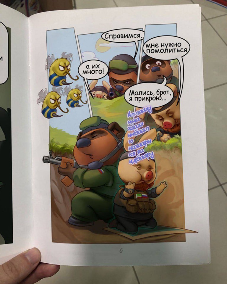 В России в продаже появился новый антиукраинский комикс, персонажами которого сделали Винни-Пуха и Пятачка. По сюжету животные сражаются с сине-желтыми пчелами. К тому же Пятачок – мусульманин.