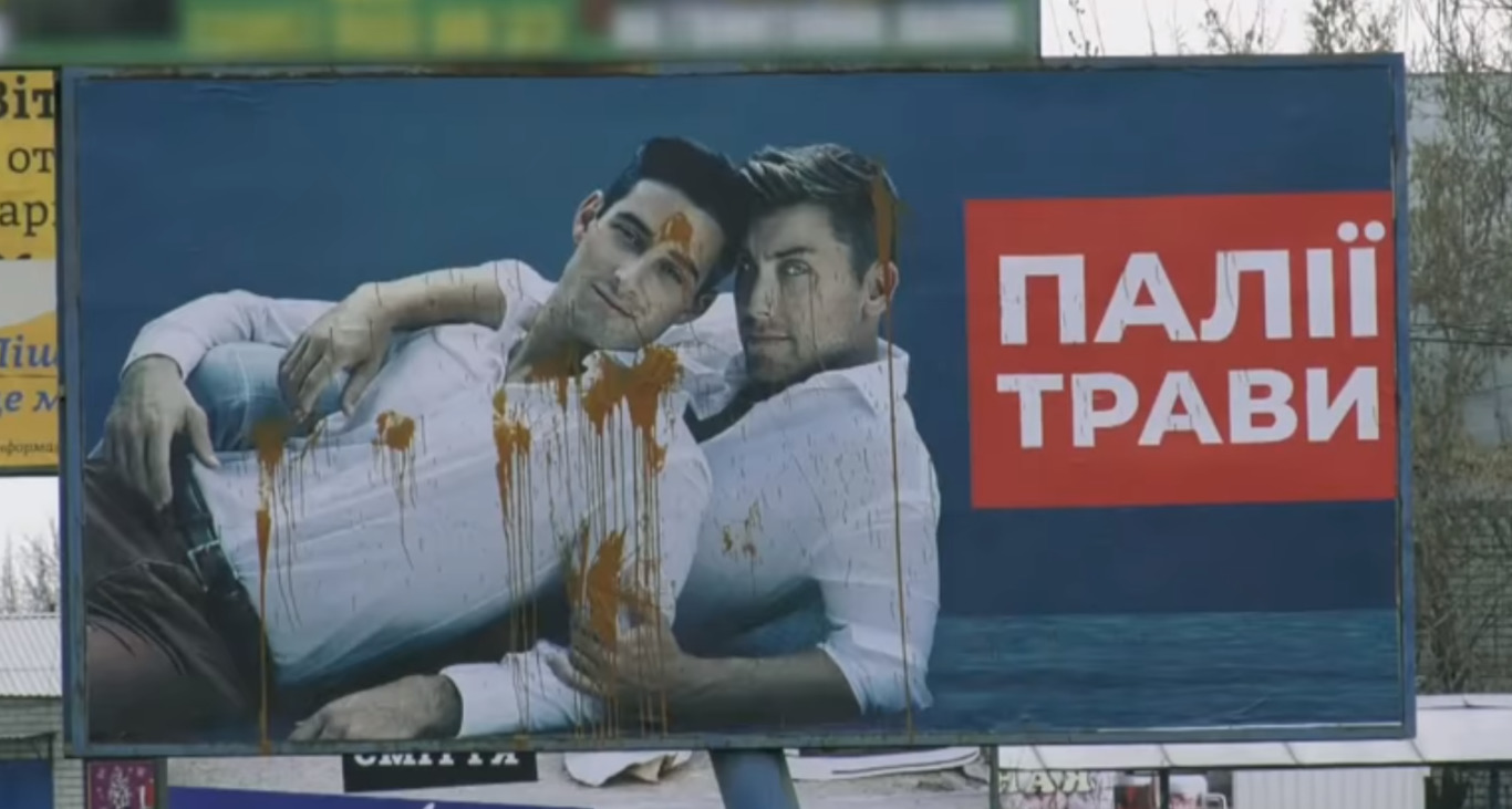 В Днепропетровской области появился билборд, на которых изображены двое мужчин, которые обнимаются. Также на борде есть надпись "Поджигатели травы" - и никаких объяснений.