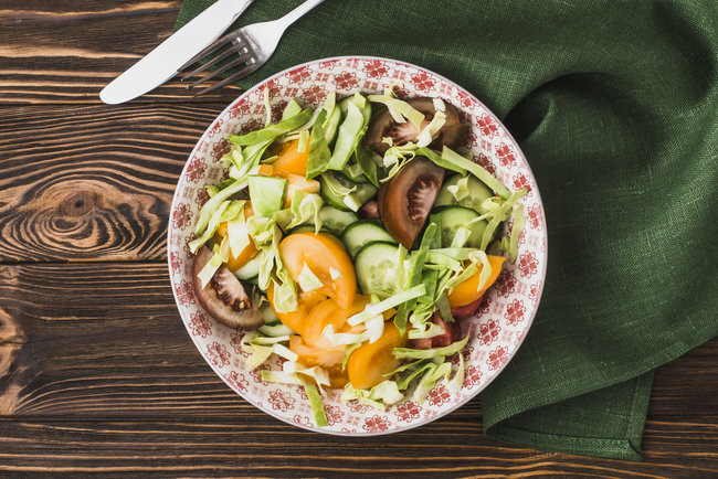 Помидоры порезать ломтиками, огурцы – кружочками. Зелень мелко порубить. Все перемешать.