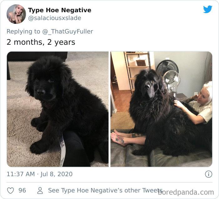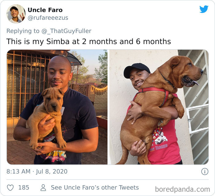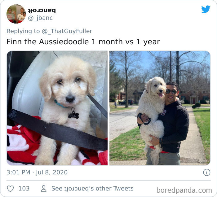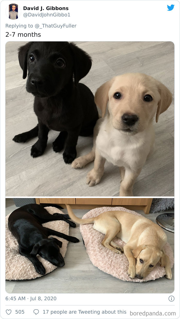 Он опубликовал селфи с кудрявым золотостым дудлом, когда ему было всего 2 месяца, а рядом разместил такой же снимок вместе с собакой, которой исполнилось уже 7 месяцев.
