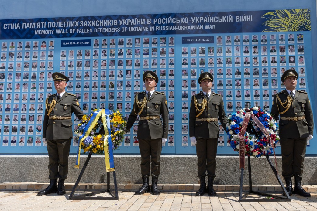 В Киеве на Михайловской площади воины почетного караула установили венки от глав государств к Стене памяти погибших в Украине. Под звуки трубы президенты отдали почтение павшим воинам ВСУ.