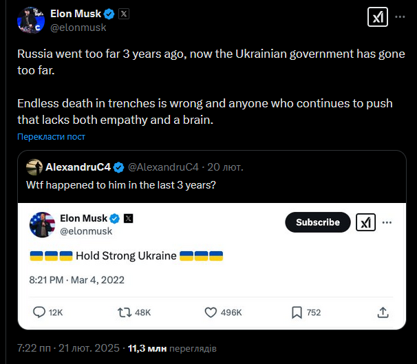 Таковым является ответ на комментарий одного из пользователей, который напомнил Маску его слова, сказанные в 2022 году. Тогда он написал: "Держись крепко, Украина". Пользователь спросил, "что могло произойти с ним за последние три года?"