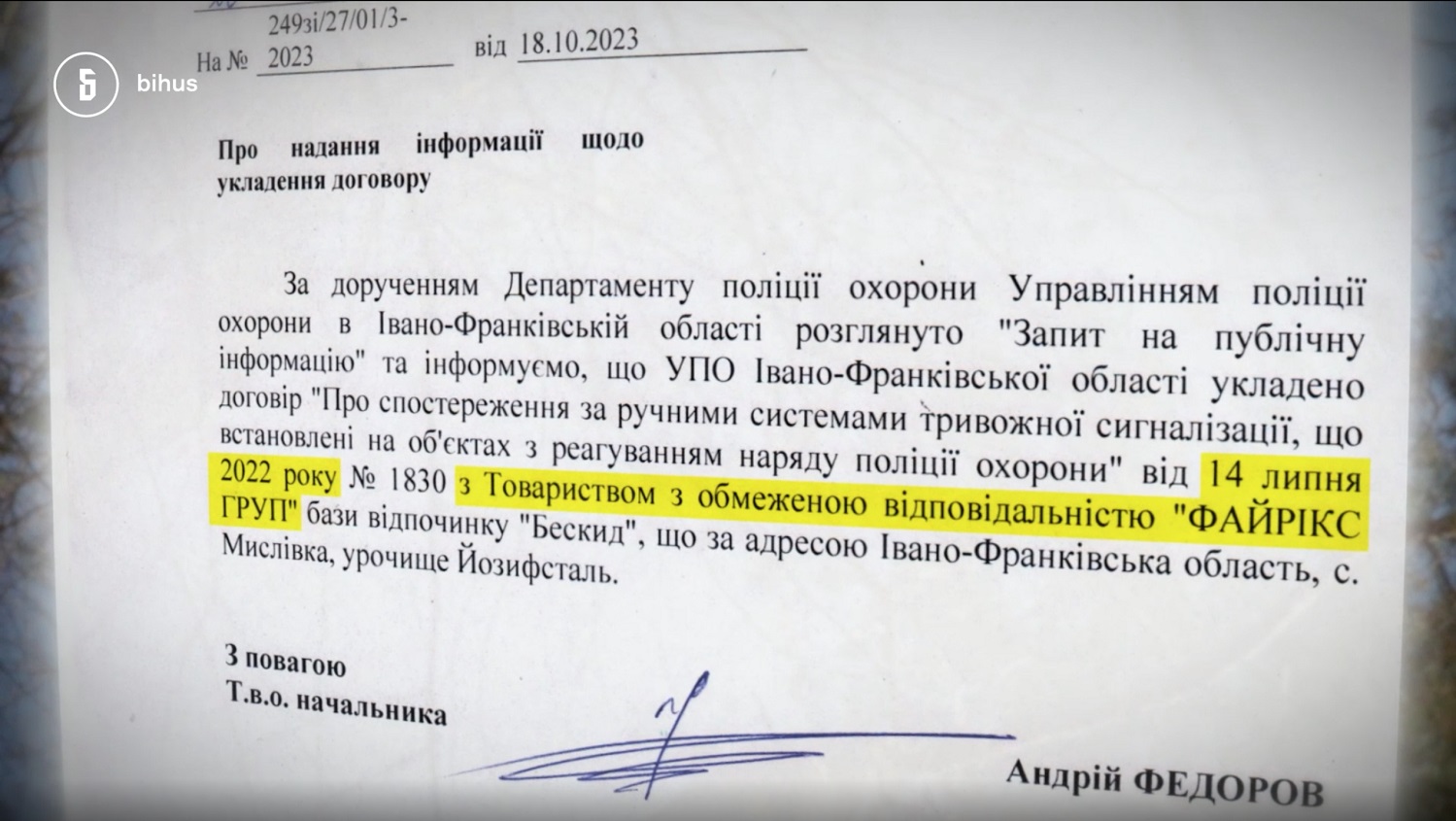 Полицию охраны в гостиницу Медведчука наняла компания - ООО "Файрикс Групп". Внешне она не ведет Медведчука. Но объяснить желание этой фирмы оплачивать охрану гостиницы Медведчука можно именно тем, что она действует в интересах Медведчука-Марченко. Дата заключения договора с полицией охраны в отеле "Бескид" - июль 2022 г. - также исключает, что полицию охраны наняли управители от государства, ведь договор заключен еще до передачи гостиницы в управление АРМА. Судя по ответу Управления полиции охраны в Ивано-Франковской области, договор до сих пор действует.