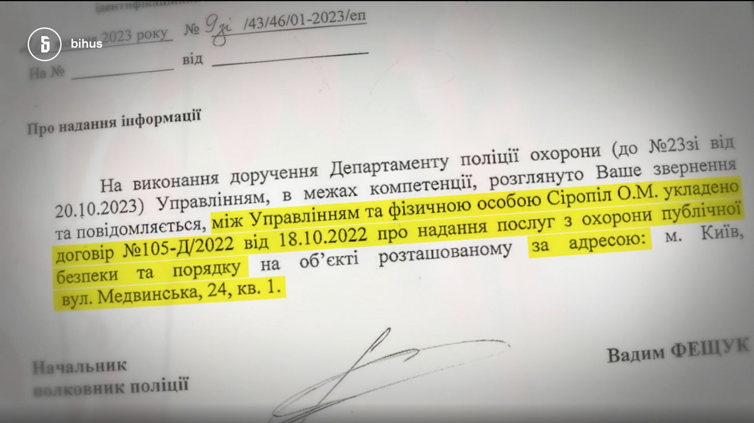 Уточняется, что, скорее всего, речь идет об Александре Николаевиче Сирополе - завхозе Медведчуке из его личного имения. В телефонных книгах других людей Александр Сиропил подписан как "Саша Завхоз Мед", "Саша завхоз Пуща", "Саша Управляющий Пуща", "Александр Вышгородская 152", "Александр Хутор Редьки Борода" и т.д. Все это - названия, указывающие на расположение собственного имения Медведчука под Киевом. Договор с полицией охраны Сиропил подписал в октябре 2022 г. До этого за охрану дома Марченко платил ее сын Богдан. С сыном Марченко полиция заключила договор вскоре после полномасштабного вторжения России, в марте 2022 года. То есть, несмотря на санкции по блокированию всех активов Медведчука и Марченко, им, очевидно, удается оплачивать услуги полиции охраны в доме Марченко с помощью завхоза Медведчука.