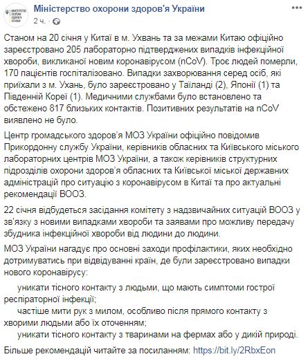 Центр общественного здоровья МОЗ Украины официально сообщил Пограничной службе Украины, руководителям областных и Киевского городского лабораторного центра Минздрава Украины, а также руководителей структурных подразделений здравоохранения областных и Киевской городской государственных администраций о ситуации с коронавирусом в Китае и об актуальных рекомендациях ВОЗ.
