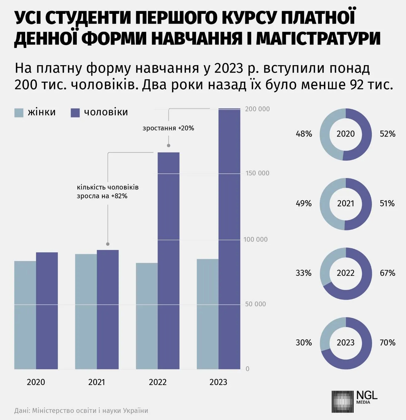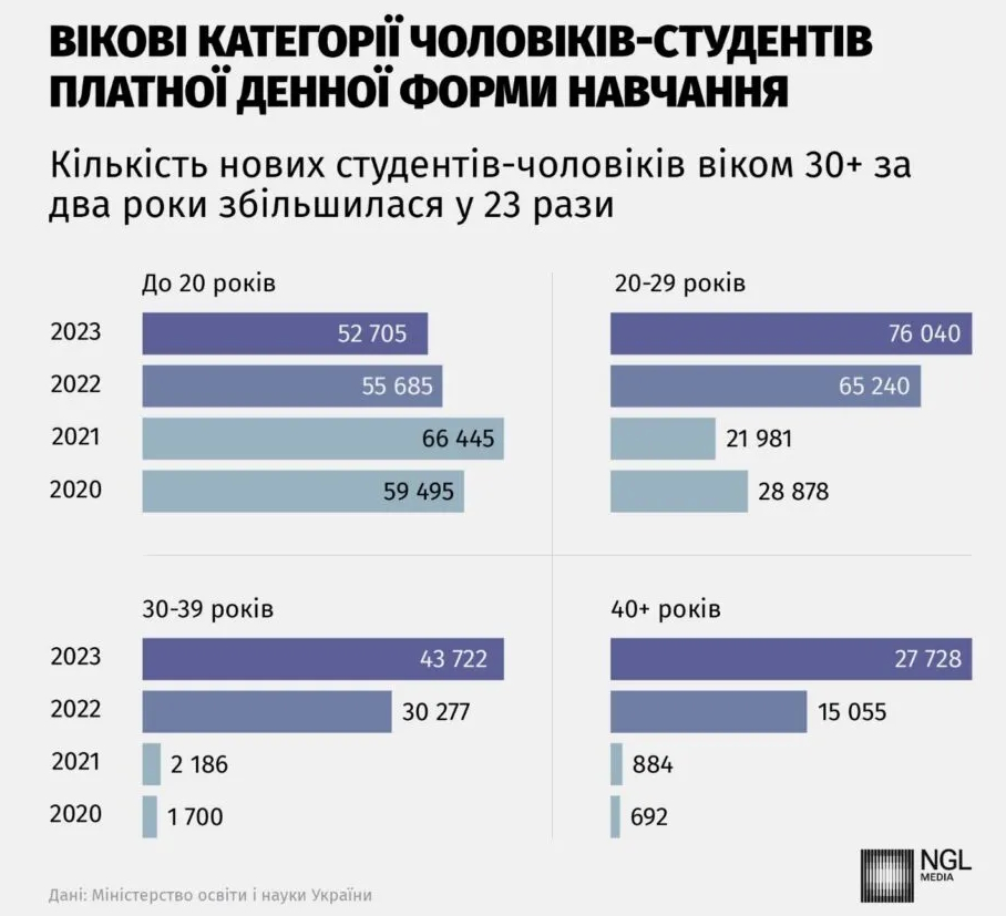 На платную форму обучения в текущем году поступило уже 110 тысяч мужчин, хотя в прошлом году их было 85 тысяч. Абитуриентов не пугает даже цена контракта, ведь за обучение придется заплатить в среднем 24 тысячи гривен. ВУЗы уже получили от студентов в возрасте 27 лет более 2,6 млрд гривен дохода.