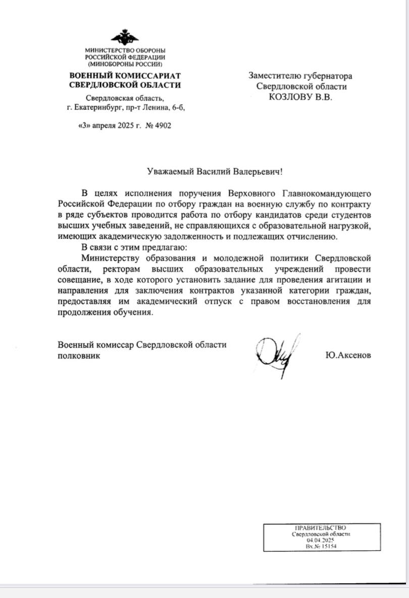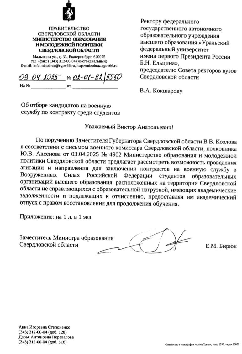 Власти Свердловской области РФ совместно с Министерством образования рекомендовали ректору Уральского федерального университета начать массовую кампанию по отправке студентов на контрактную армию.