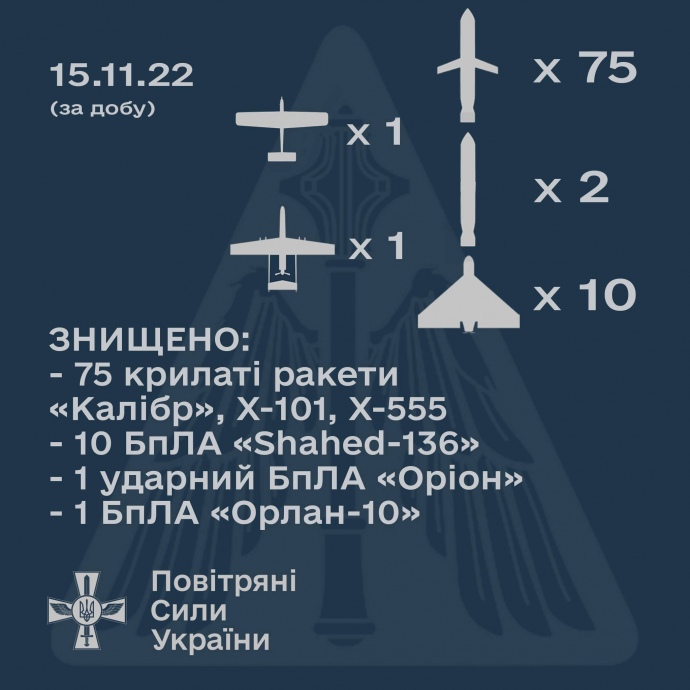 Атака по Украине 15 ноября ракетами и дронами обошлась России в сумму от 500 млн до 1 млрд долларов.
