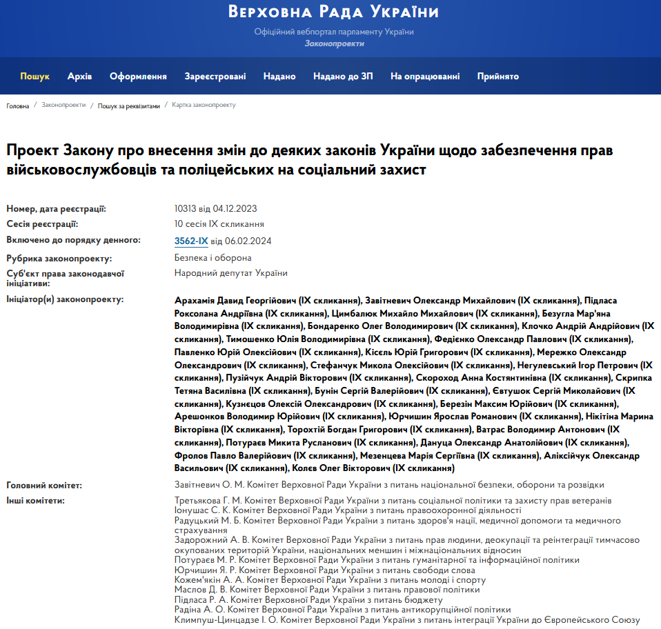 Речь идет о проекте закона №10313 "О внесении изменений в некоторые законы Украины по обеспечению прав военнослужащих и полицейских на социальную защиту".