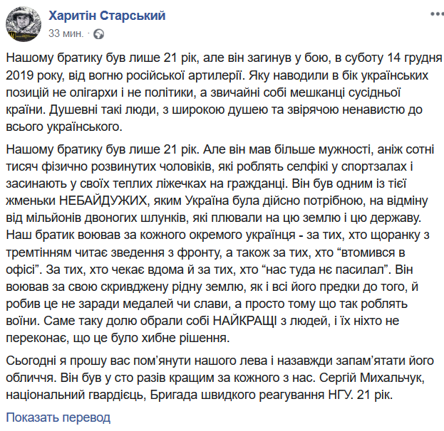 "Нашему братику был всего 21 год, но он погиб в бою, в субботу, 14 декабря 2019 года, от огня русской артиллерии. Которую наводили в сторону украинских позиций не олигархи и не политики, а обыкновенные жители соседней страны. Душевные такие люди, с широкой душой и звериной ненавистью ко всему украинскому", - отметил он.
